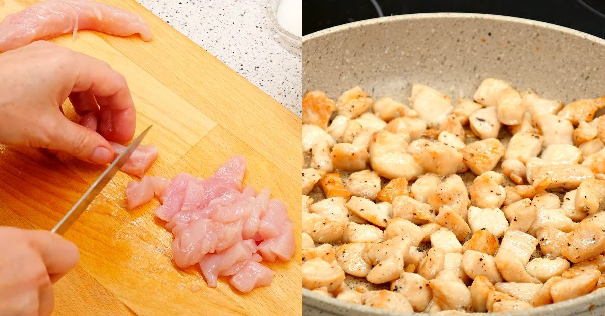 1. Umytego i osuszonego fileta z kurczaka, pokrój w kostkę. Dopraw do smaku pieprzem, solą i dokładnie wymieszaj. Obraną, czerwoną cebulę, pokrój w drobną kostkę, czosnek przeciśnij przez praskę.