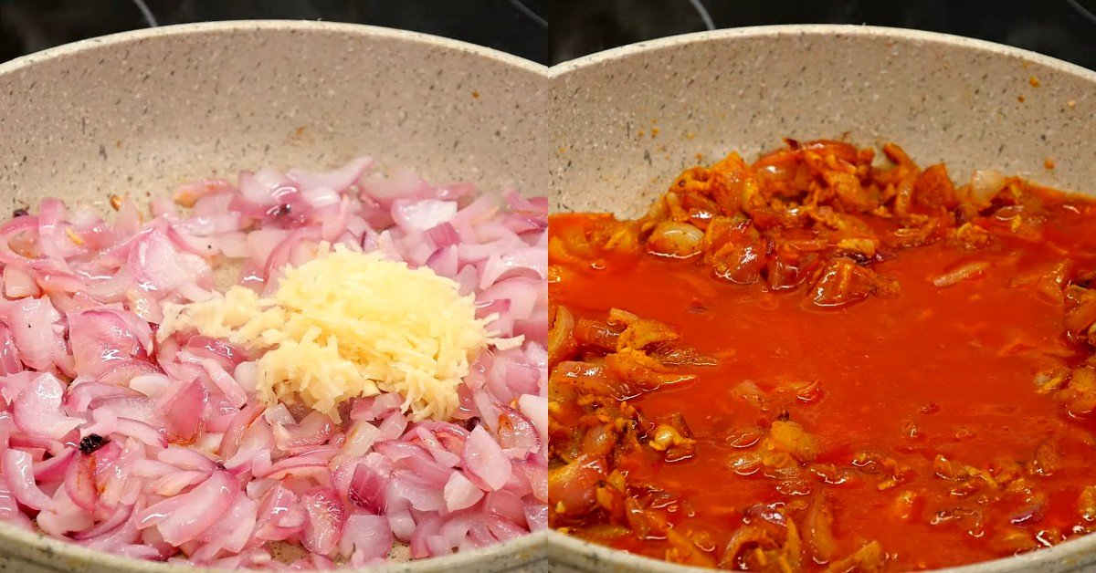 2. Na rozgrzanej patelni z olejem, podsmaż fileta, a gotowego przełóż do miski. Dolej odrobinę oleju i na tej samej patelni podsmaż cebulę, a następnie czosnek. Dopraw do smaku curry, dodaj sok pomidorowy i odrobinę cukru. Dokładnie wymieszaj.