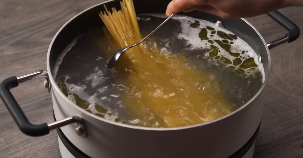 2. W wysokim garnku, ugotuj makaron z dodatkiem soli i 1,5 łyżki oleju słonecznikowego. Czas gotowania, powinien być o minutę krótszy niż wskazany na opakowaniu. Odlej do miski 100 ml wody w której gotowany był makaron. Makaron odcedź przez sito.