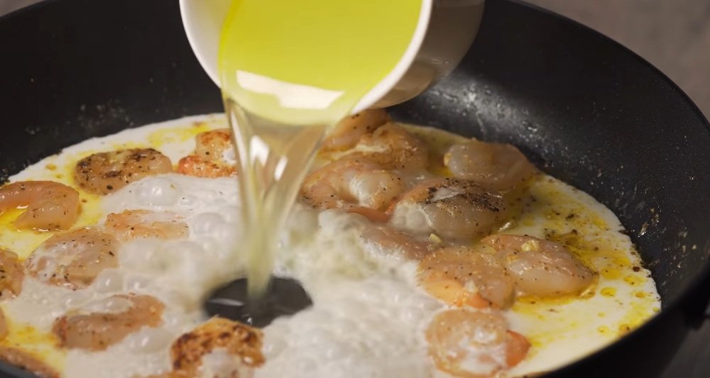 3. Na rozgrzanej patelni z odrobina masła i oleju słonecznikowego, podsmaż krewetki po 2 minuty z każdej strony, doprawiając do smaku solą i pieprzem.