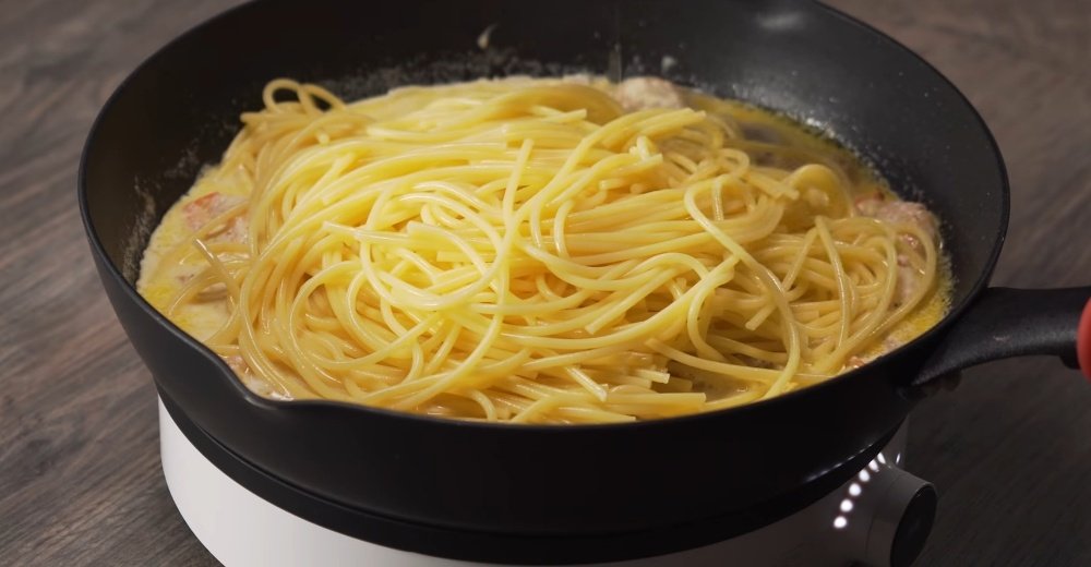 6. Po tym czasie, na patelnię przełóż makaron i dobrze wymieszaj. Po minucie zdejmij z ognia i nałóż na talerze. Gotowe!