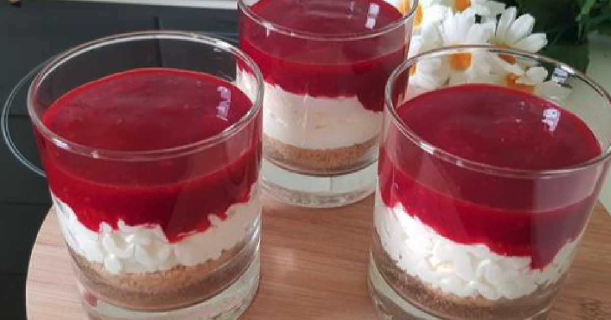 4. Na dnie pucharków, ułóż warstwę z herbatników, przykryj warstwą kremu, a wierzch polej musem malinowym. Gotowe!