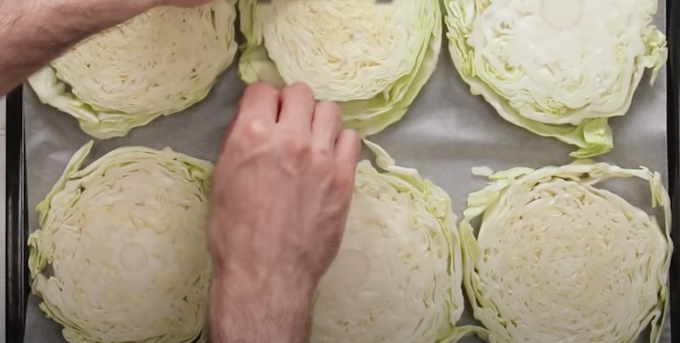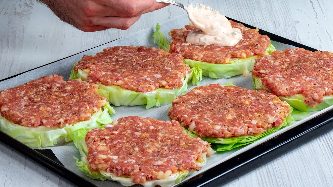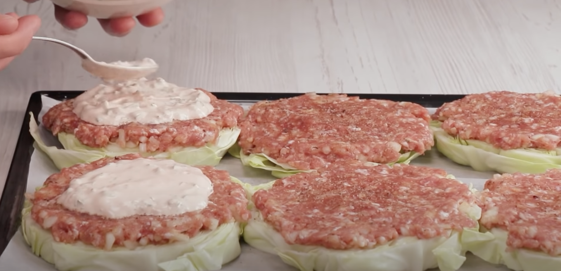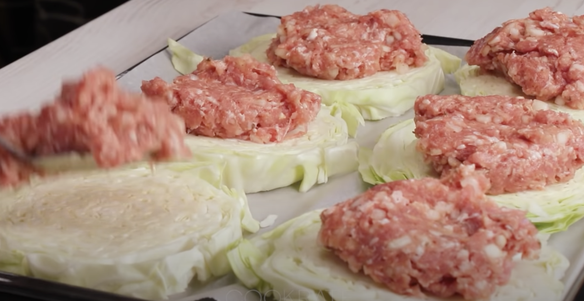 4. Z mięsa, uformuj kotlety, rozpłaszcz je w dłoni i poukładaj na plastrach kapusty.