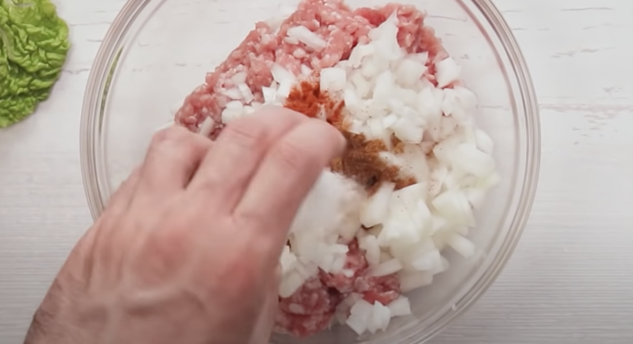 3. W misce, wymieszaj mięso mielone z drobno pokrojoną cebulą i przyprawami.