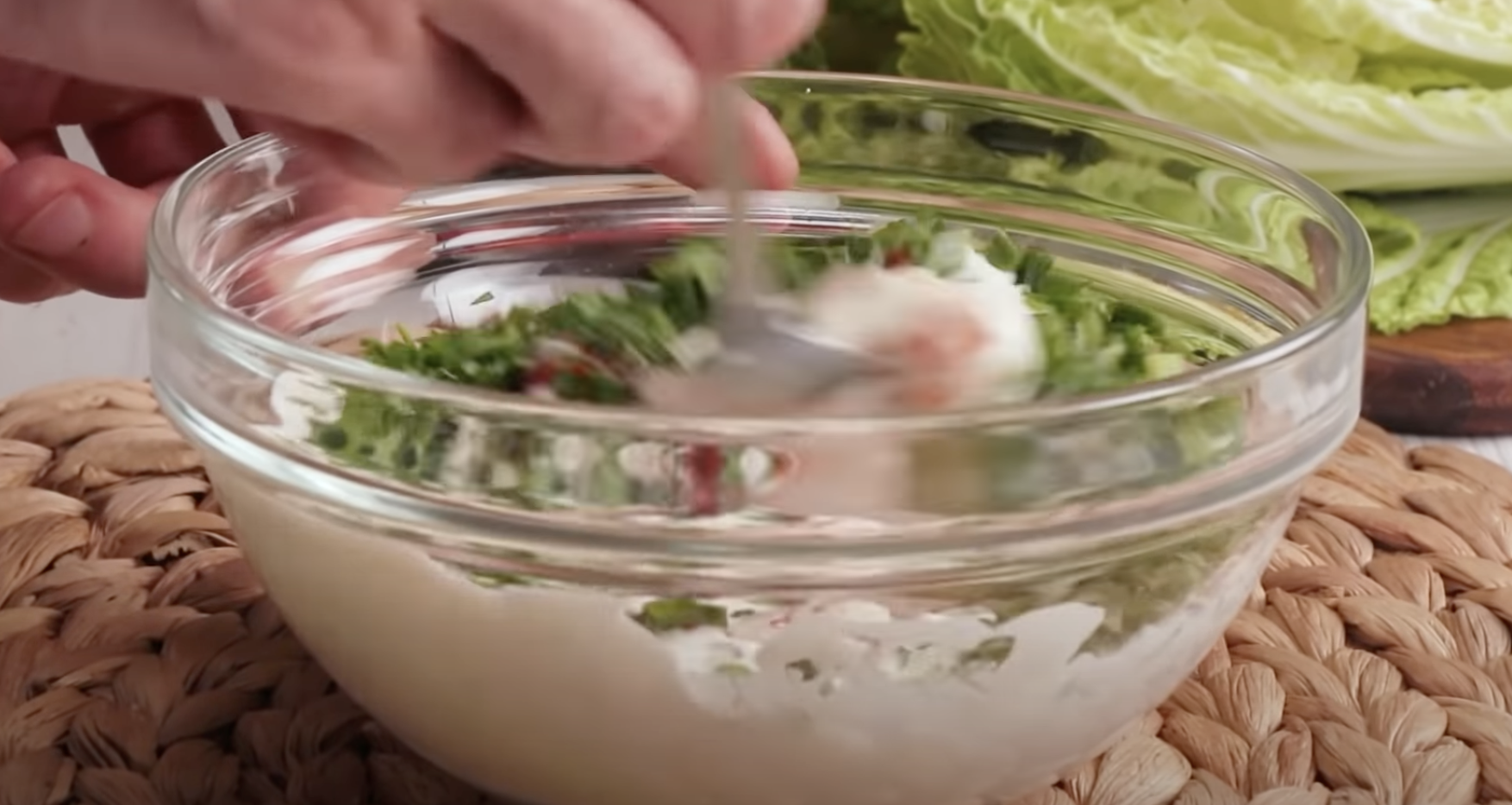 5. W osobnej misce, wymieszaj jogurt naturalny z koncentratem pomidorowym, posiekaną natką pietruszki i pokrojonym szczypiorkiem.
