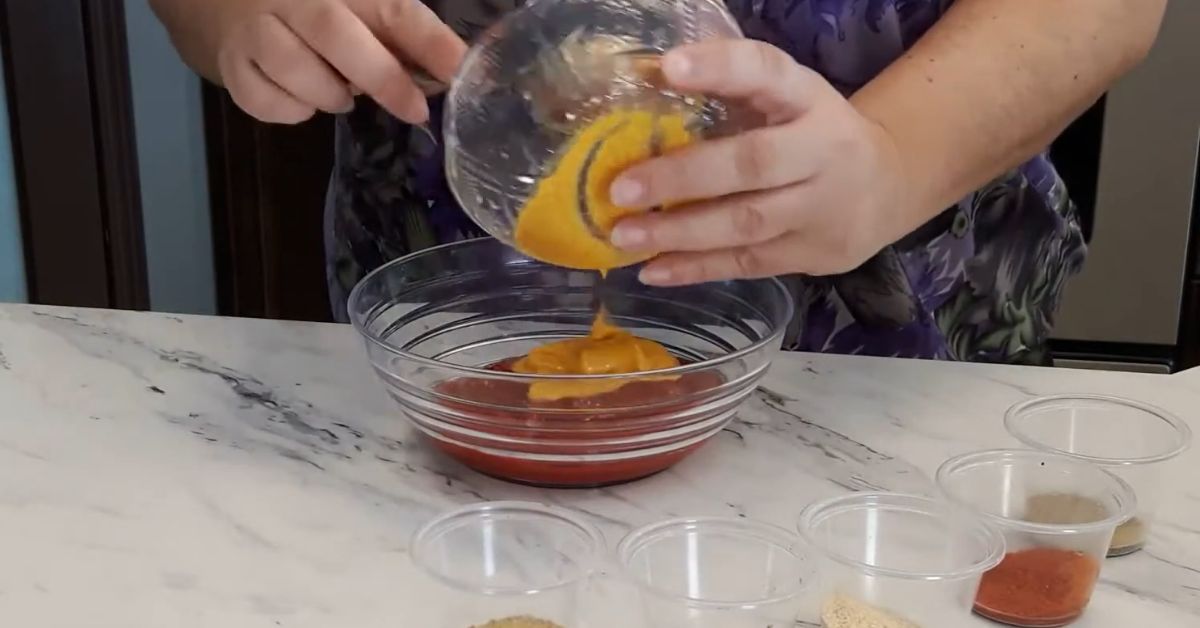 2. W gorącej wodzie, rozpuść kostkę bulionową z miodem i wymieszaj. Następnie, dodaj ketchup, sos barbecue i sok z pomarańczy.