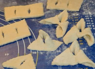 2. Następnie, rozwałkuj je na posypanym mąka blacie roboczym i wytnij z ciasta prostokąty dowolnej wielkości. Na środku każdego zrób nacięcie i przełóż przez dziurkę połowę ciasta.