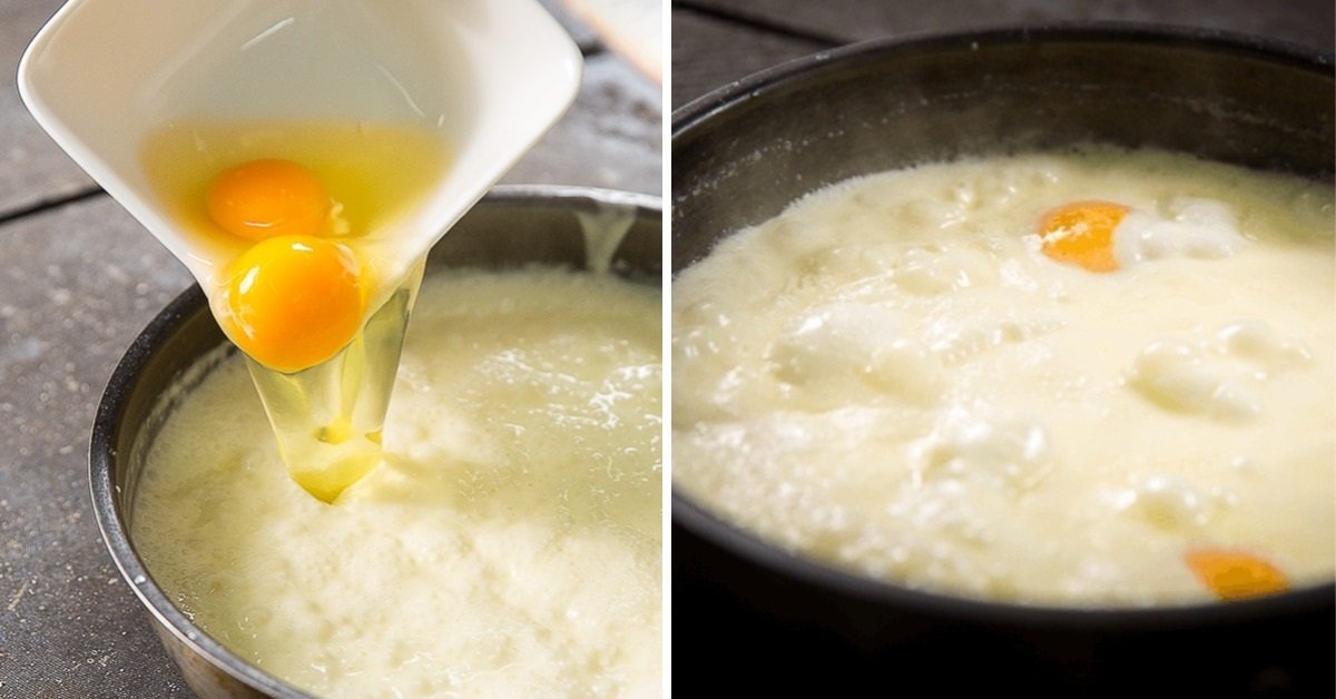 1. Do glinianej formy lub patelni ze zdejmowaną rączką, wlej śmietanę, wbij jajka, posól do smaku i ułóż na wierzchu cienkie plasterki masła.