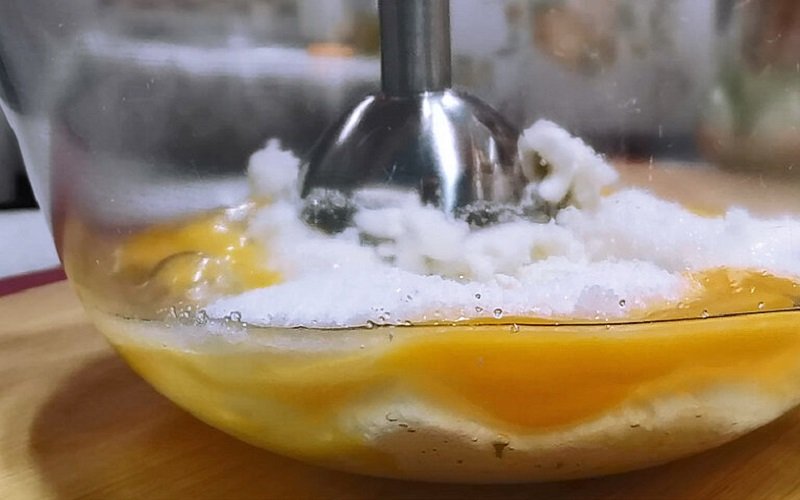 1. Do miski, włóż twaróg, dodaj cukier waniliowy, 2 jajka, 70 g cukru i sól. Zblenduj całość do uzyskania jednolitej, gładkiej masy.