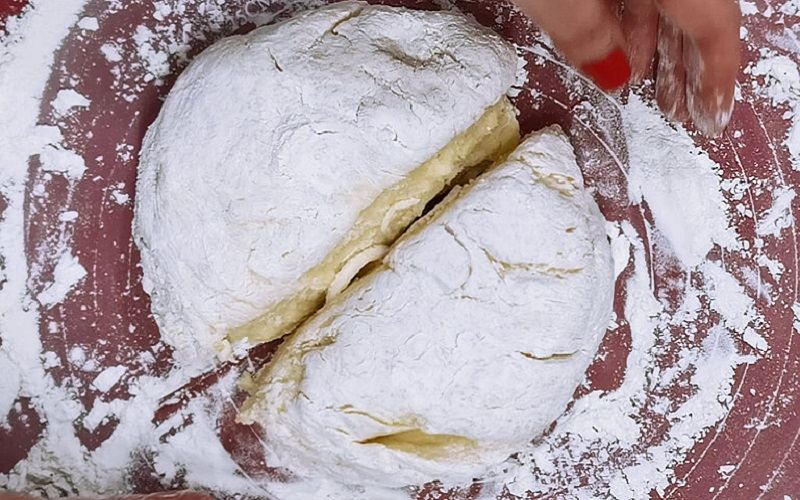 2. Do masy, dodaj mąkę, proszek do pieczenia, olej i zagnieć gładkie ciasto. Z przygotowanego ciasta, uformuj kulkę i podziel ją na pół, potem je rozwałkuj.