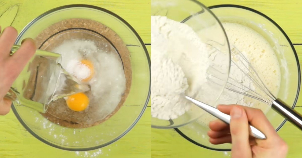 2. Połącz ze sobą suche składniki z mokrymi i dokładnie wymieszaj trzepaczką. Masa powinna być jednolita i gładka.
