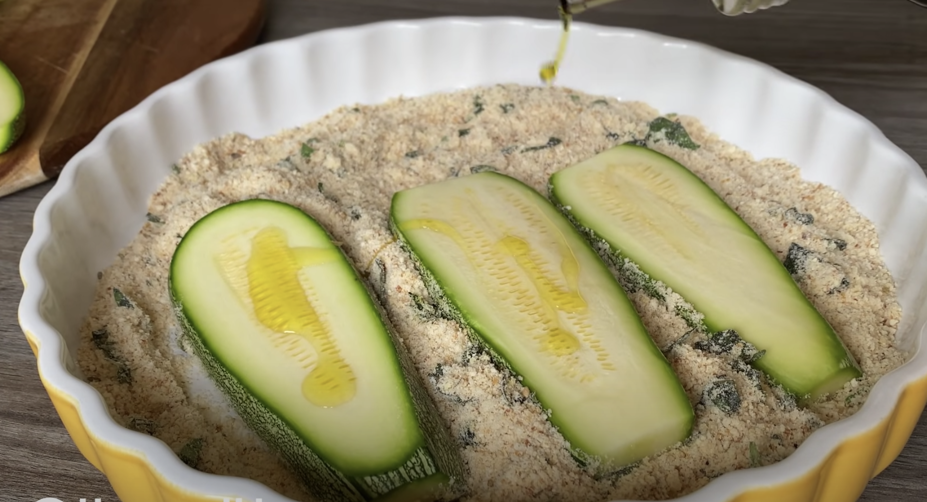 5. Plasterki cukinii, przyłóż do panierki stroną wysmarowaną oliwą.