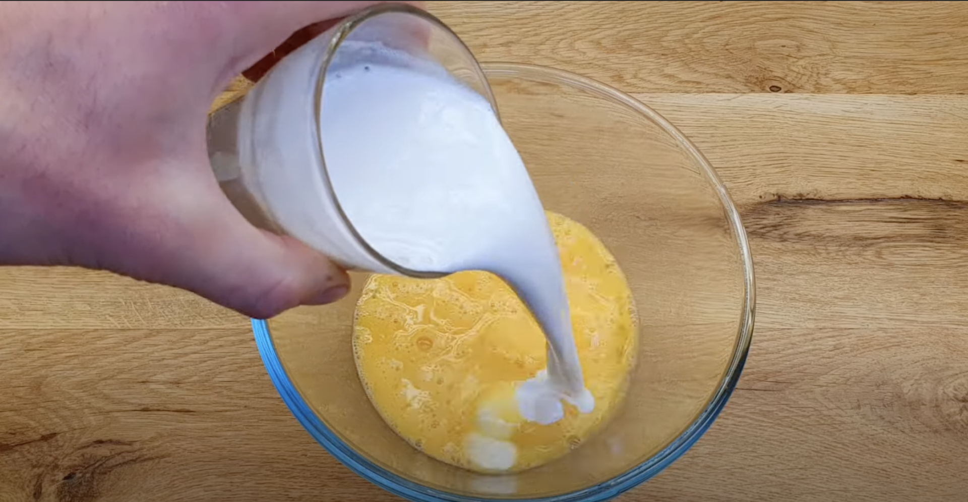 2. Naczynie żaroodporne posmaruj odrobiną oliwy , następnie przełóż do niego przyprawione mięso. Do miski wlej śmietanę, następnie dodaj jajka, drobno posiekany czosnek oraz ulubione przyprawy. Całość dokładnie wymieszaj, aby wszystkie składniki dobrze się ze sobą połączyły.