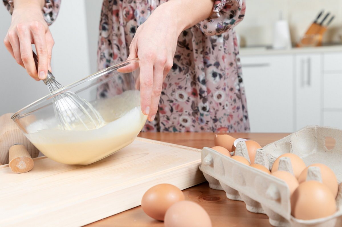 2. Teraz, do jeszcze ciepłego mleka, dodaj przesianą mąkę i cukier. Dobrze wymieszaj, aby cukier całkowicie się rozpuścił.