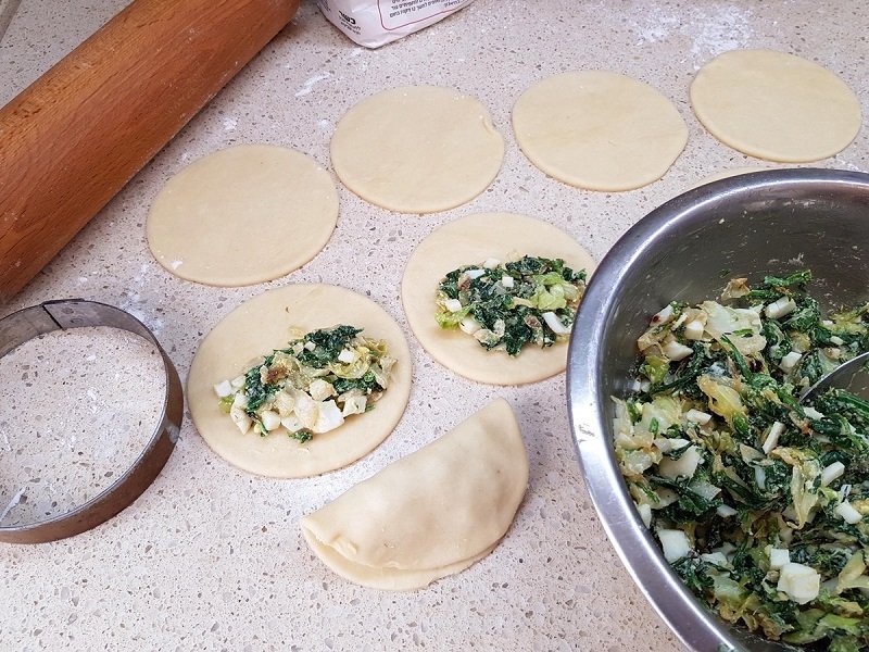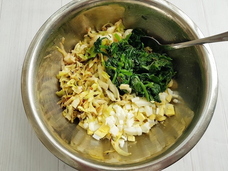 3. W tym czasie, zrób nadzienie: Na patelni, podsmaż drobno posiekaną cebulkę, potem dodaj posiekany szpinak (może być mrożony). Jajko ugotuj na twardo wystudź i pokrój w drobną kosteczkę. Wymieszaj jajko ze szpinakiem, dodaj roztopione masło, dopraw do smaku solą, ulubionymi przyprawami lub ziołami i wymieszaj dokładnie.