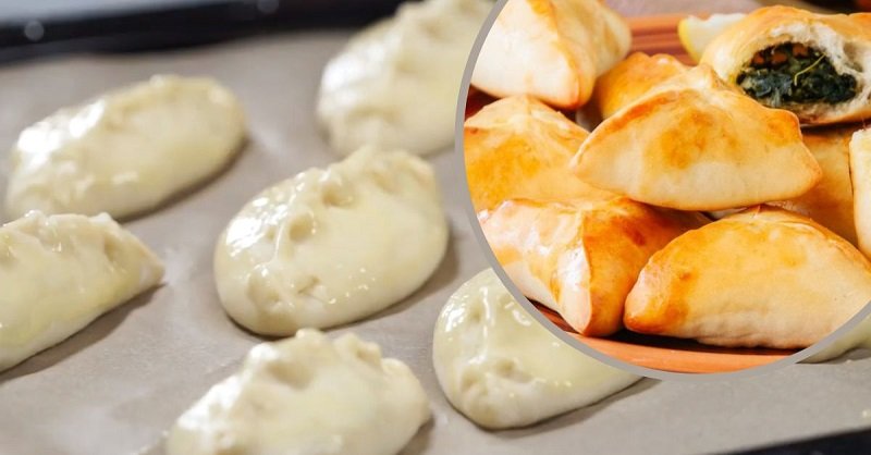 5. Każdą rozwałkuj na cienkie placki i na środku ułóż porcję nadzienia. Sklej brzegi w kształt zbliżony do pieroga. Poukładaj bułeczki na blaszce, przykrytej papierem do pieczenia i wysmarowanej olejem.