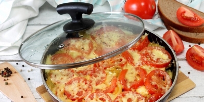5.Przyprawione danie , koniecznie przykryj pokrywką, po czym smaż przez 10 minut, następnie dodaj starty ser oraz pokojone na mniejsze kawałki pomidory.