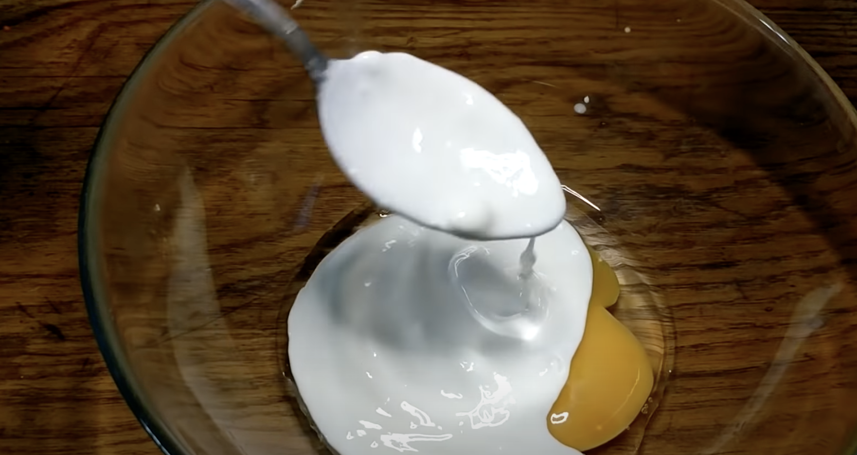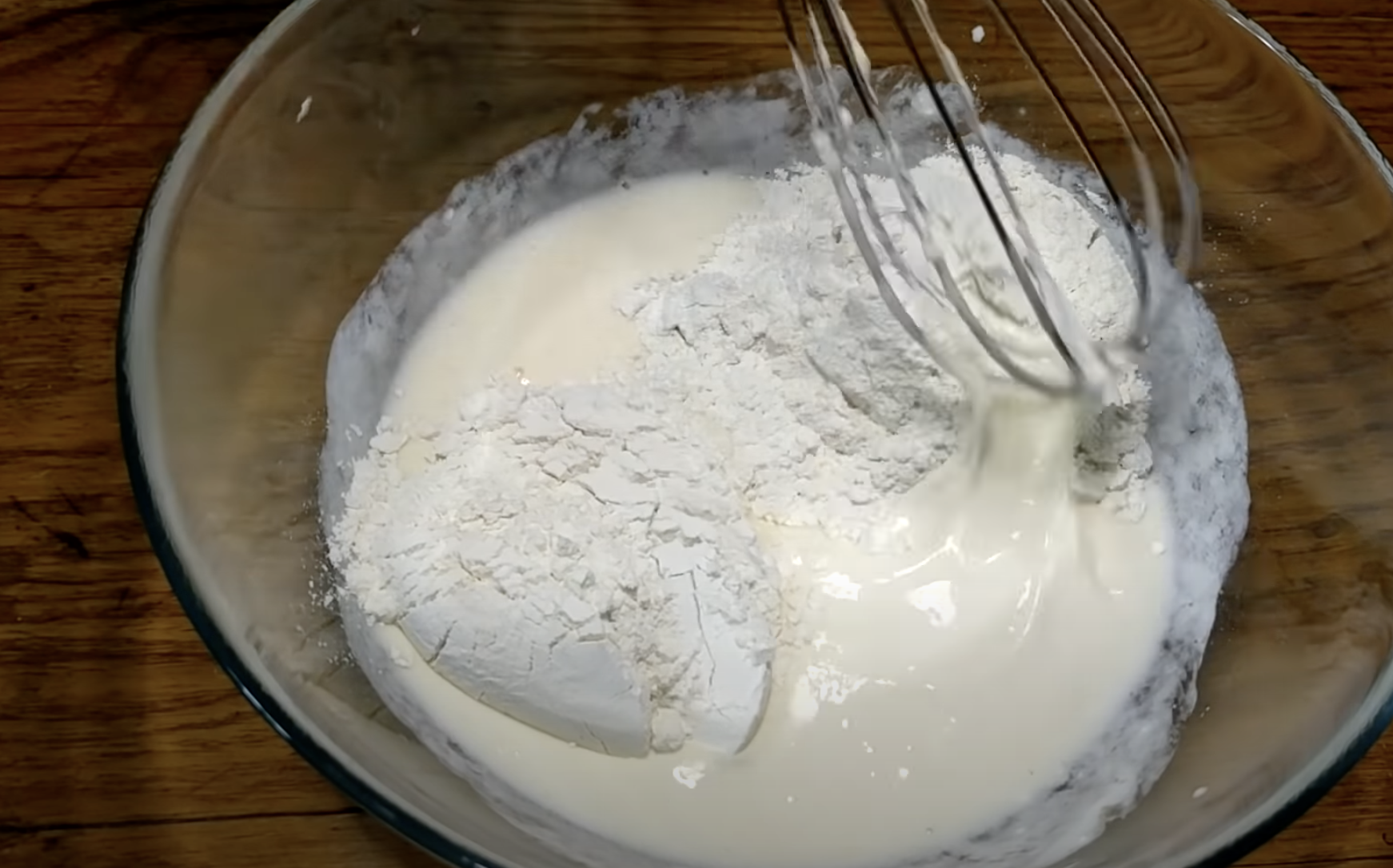Mieszaj, aż będzie gładkie. Dodać 6 łyżek mąki. Ciasto mieszamy tak, aby nie było w nim grudek.