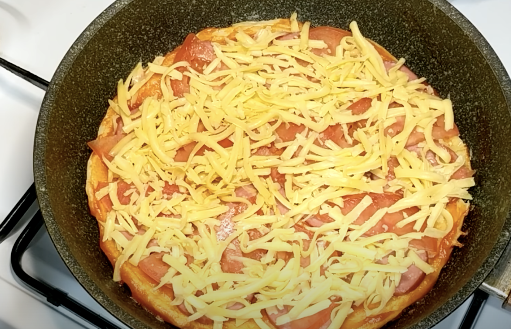 Przykryć pokrywką. Trzymaj na średnim ogniu przez 2 minuty. Gdy będzie upieczony z jednej strony, przewróć go na drugą stronę. Teraz rozłóż pizzę keczupem, rozłóż nadzienie. Gotuj jeszcze kilka minut z zamkniętą pokrywką. Gotuj, aż ser się rozpuści.