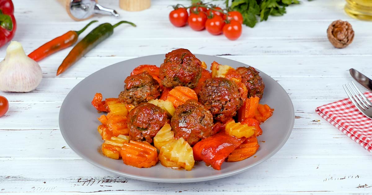 3. Przygotowane warzywa, przełóż do naczynia żaroodpornego. Z przygotowanego wcześniej mięsa, uformuj małe pulpeciki i poukładaj je na warzywach w naczyniu. Całość, zalej sosem pomidorowym. Naczynie, przykryj folią aluminiową.