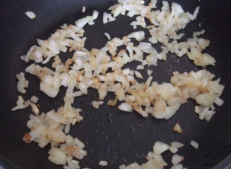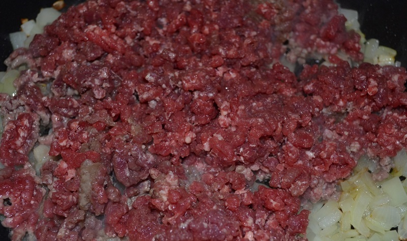 4. Na patelni rozgrzej odrobinę oleju, po czym na złoty kolor podsmaż pokojoną cebulkę. Następnie dodaj do niej mielone mięso oraz całość przypraw szczyptą soli i pieprzu, po czym dokładnie wymieszaj.