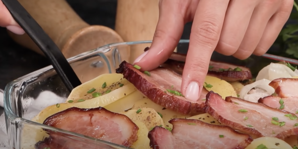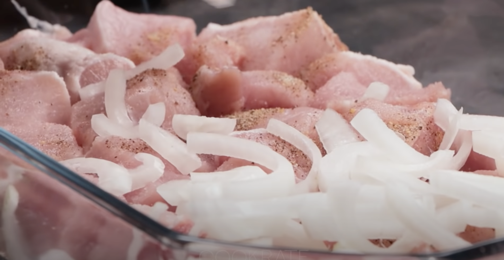 4.Na kawałkach mięsa układaj obraną oraz pokrojoną w pół piórka cebulę.