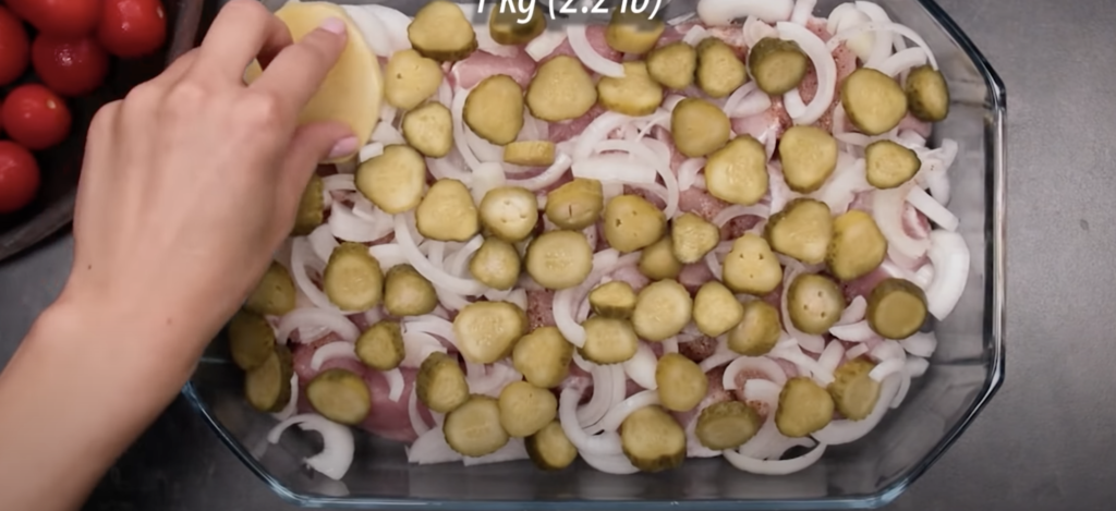 5.Kolejną warstwę utwórz z pokojonych plasterków ogórków kiszonych.