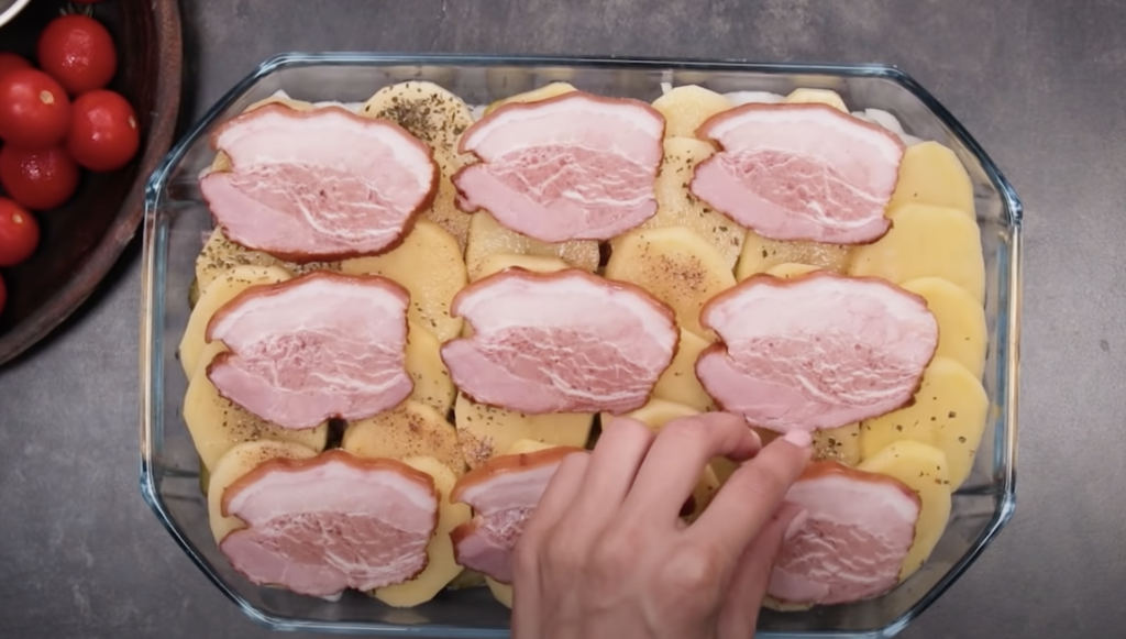 6.Na ogórki połóż plasterki ziemniaków. Następnie przypraw solą, pieprzem oraz bazylią.