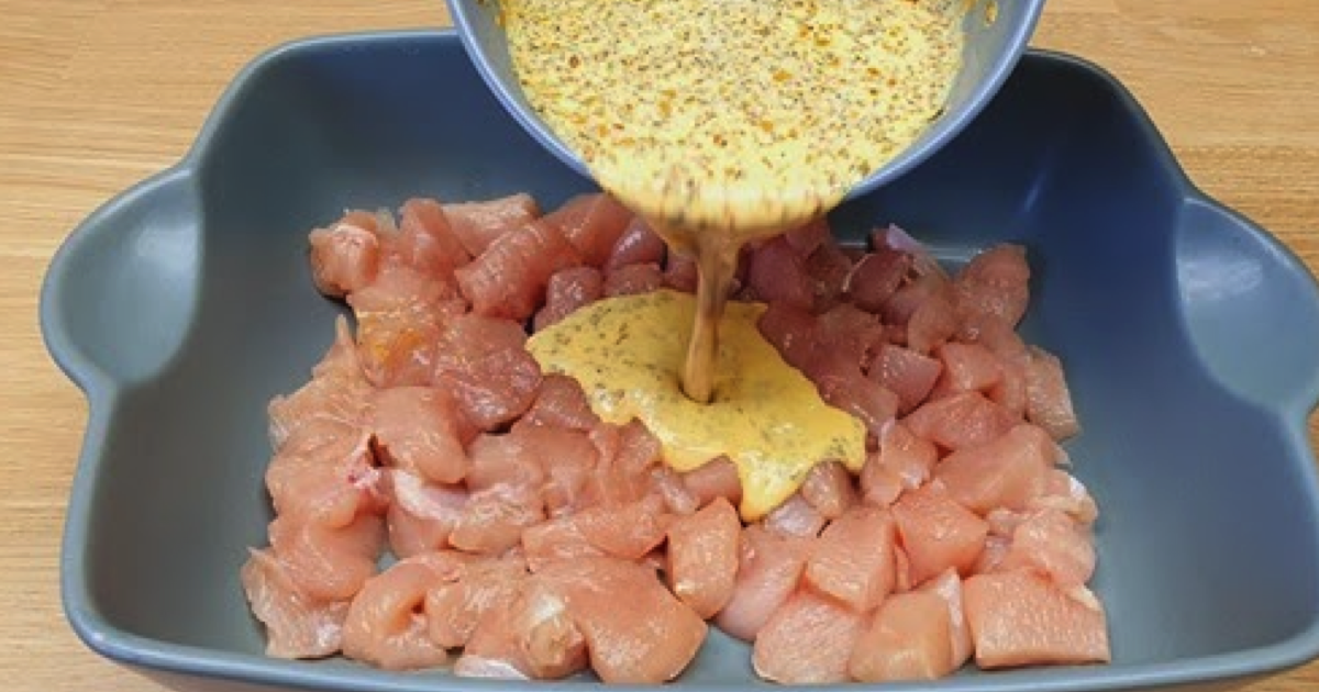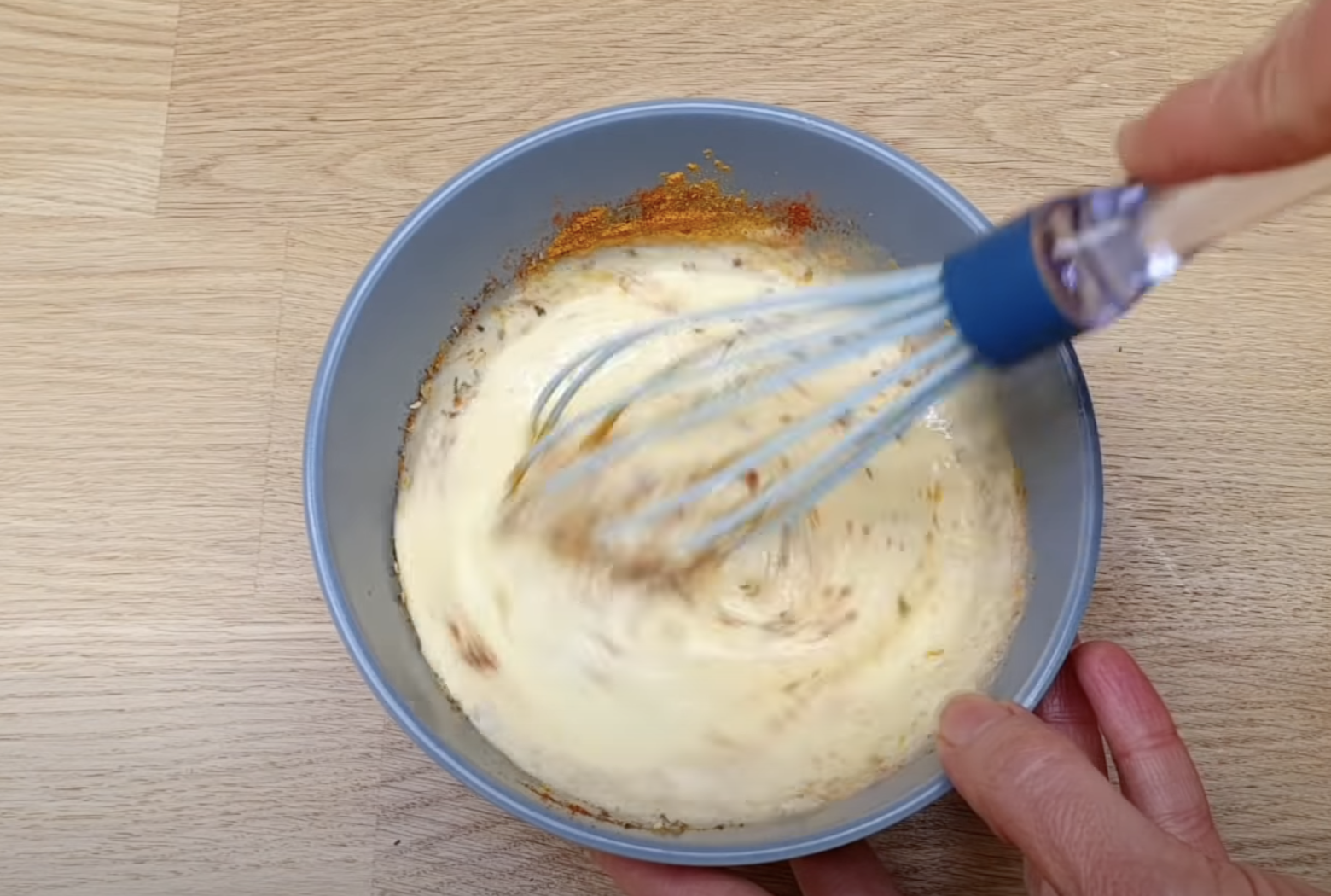 1. Na większą kostkę pokrój umytego oraz osuszonego kurczaka. Następnie umieść go w naczyniu żaroodpornym , który wcześniej posmaruj olejem. Do miski wlej śmietanę, następnie dodaj musztardę, drobno posiekany czosnek oraz przyprawę do gyrosa, całość bardzo dokładnie połącz ze sobą.