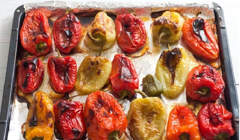 2. Paprykę w różnych kolorach, upiecz w całości (wraz z ogonkiem) w piekarniku. Po upieczeniu, paprykę obierz ze skórki i pokrój miąższ bez pestek w kosteczkę.