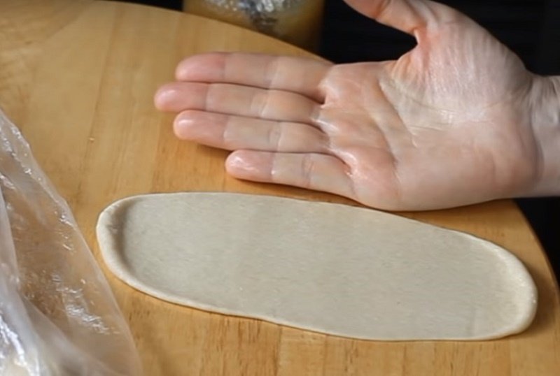 5. Każdą kulkę, rozwałkuj na cienki, podłużny placek nieco większy niż dłoń.