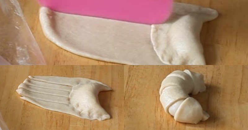 6. Na brzegu, nałóż porcję i zawiń sklejając brzegi. Odstającą część ciasta natnij w kilku miejscach i owiń nim rogaliki – jak na zdjęciu.