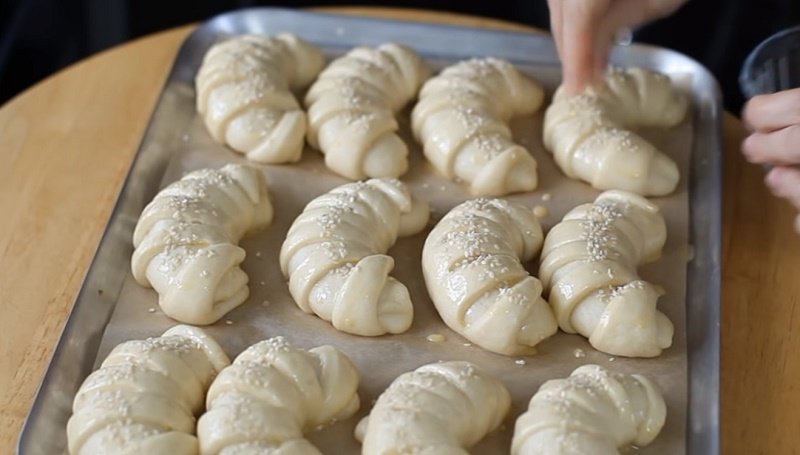 7. Rogaliki, przełóż na blaszkę, przykrytą papierem do pieczenia i odstaw ponownie na 15 minut. Potem, wysmaruj je na całej powierzchni roztrzepanym jajkiem i posyp sezamem lub cukrem.