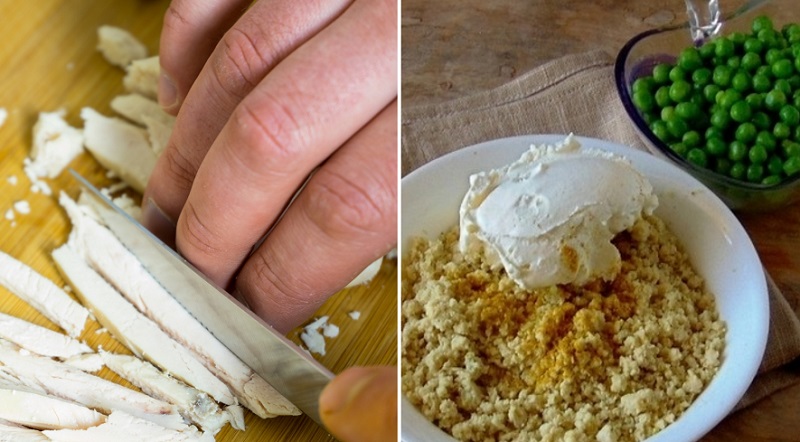 2. Gotowanego fileta z kurczaka pokrój drobno, dodaj serek śmietankowy, groszek, dopraw do smaku solą, pieprzem, lubczykiem i zblenduj na gładką masę.