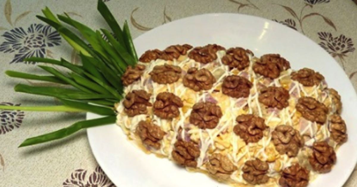 5. Wyłóż sałatkę na owalnym półmisku, formując kształt zbliżony do ananasa. Wysmaruj całość pozostałym majonezem.