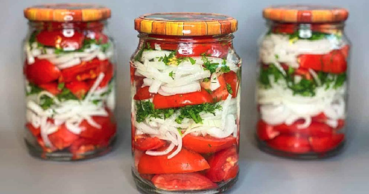 Do pomidorów, cebuli i ziół. Następnie włóż pomidory z powrotem. Powtórzyć wszystkie warstwy aż do pełna. Ostatnia warstwa to pomidory. Do garnka wlać wrzącą wodę. Wymieszaj z solą i cukrem, octem i mieszaj, aż sól i cukier się rozpuszczą. Napar przelej do szklanek, przykryj pokrywkami i odstaw na 10 minut.