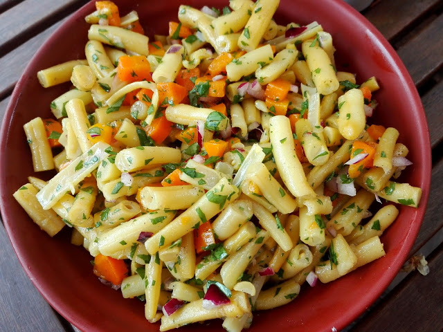 1. Fasolkę umyj oczyść, pokrój na mniejsze kawałki, marchewkę obierz i pokrój w kosteczkę. Warzywa przełóż do garnka i zalej wodą. Gotuj w osolonej wodzie do miękkości, a następnie je przecedź i wystudź.