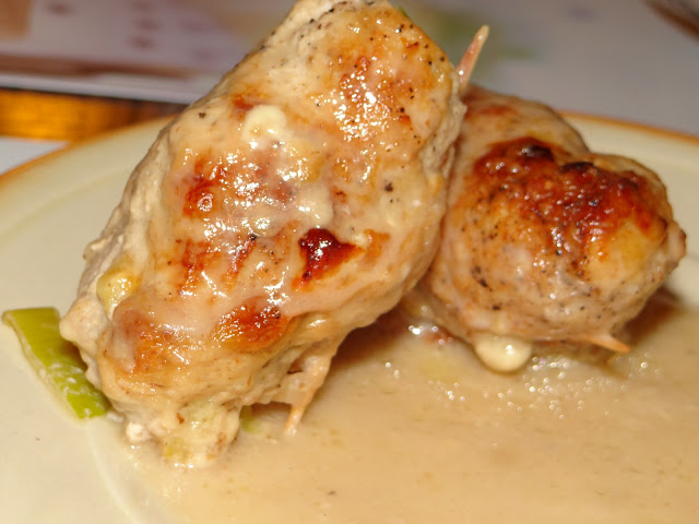 4.Tak przygotowany farsz kładź na rozbite kawałki mięsa, po czym szczelnie zwijaj , a brzegi zepnij wykałaczką.