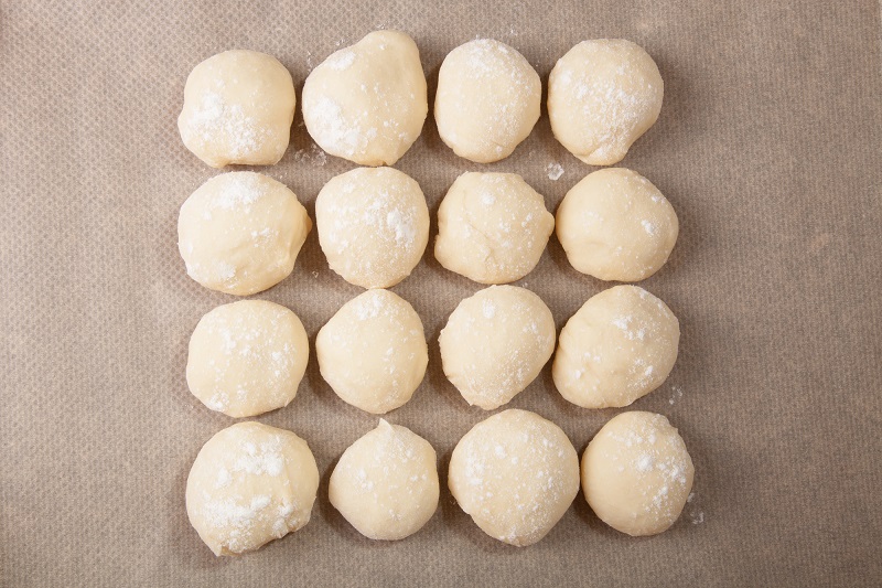 3. Z zagniecionego ciasta zacznij formować nie wielkie kulki, które następnie dłonią lekko spłaszcz, po czym z każdej strony obtocz w mące.