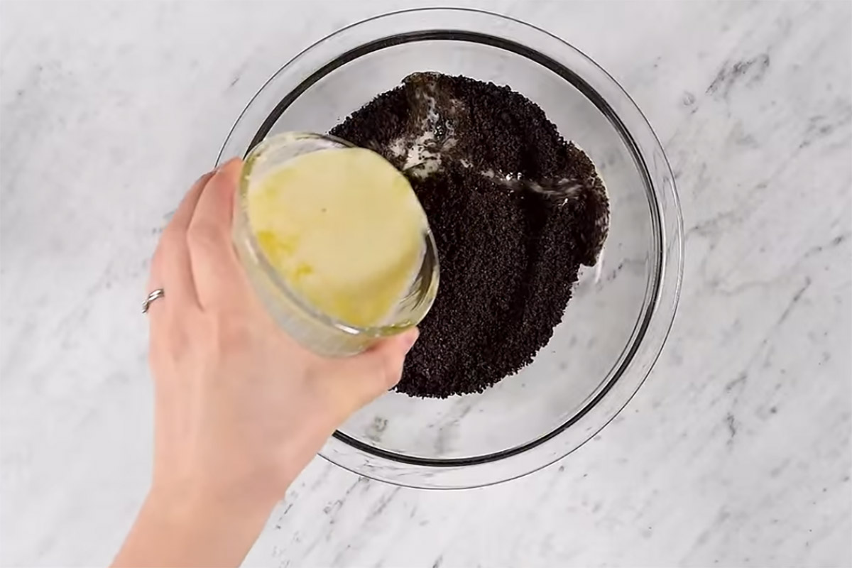 1. Ciasteczka kakaowe, zmiel drobno z pomocą blendera. Następnie dodaj do nich roztopione masło i dobrze wymieszaj. Rozpuść masło i wymieszaj z ciasteczkami. Potem, przełóż masę do formy i rozprowadź równomiernie na całej powierzchni. Wstaw do lodówki na 30 minut.
