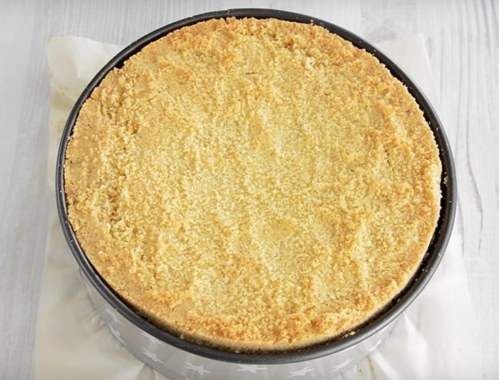 6. Gotowe ciasto, przełóż równomiernie i lekko dociskając połowę ciasta do tortownicy o średnicy 18 cm., przykrytej papierem do pieczenia.