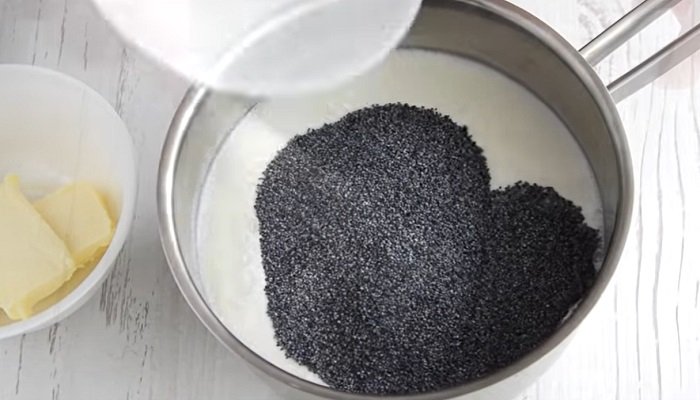 1. W małym garnku, do zimnego mleka dodaj mak, cukier i masło. Wymieszaj trzepaczką, a następnie doprowadź do wrzenia na średnim ogniu, często mieszając.