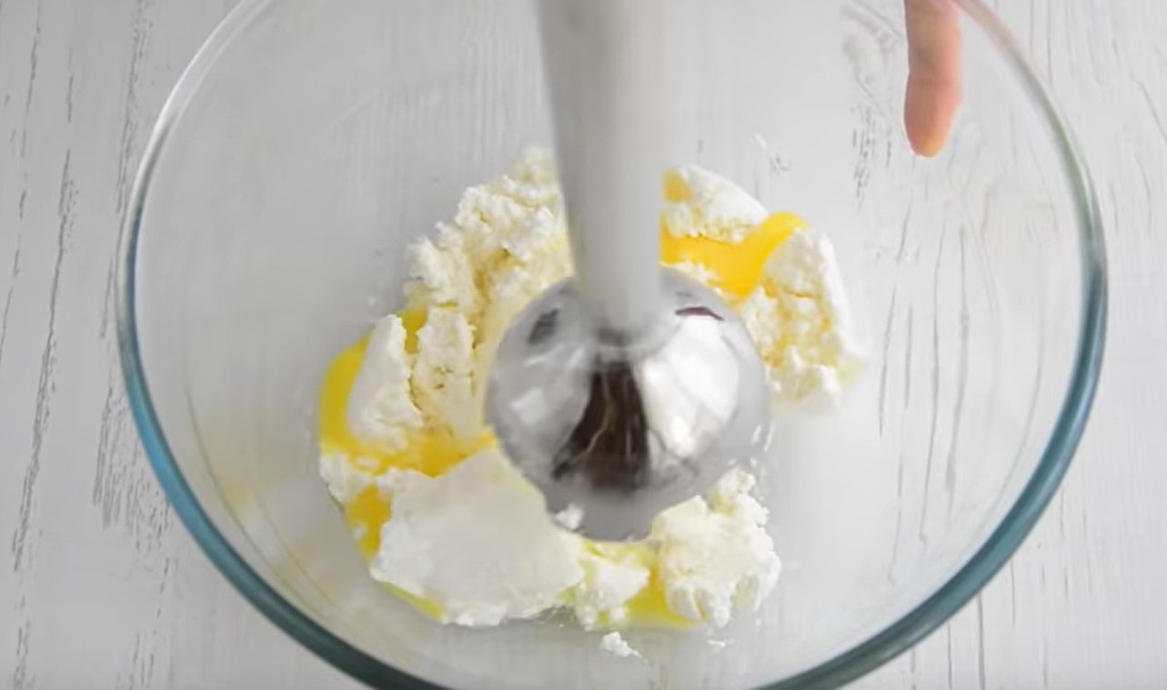 3. W misce, wymieszaj twaróg z jajkiem i szczyptą soli. Z pomocą blendera, utrzyj na gładką masę.