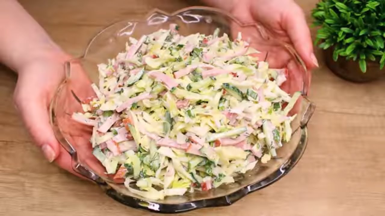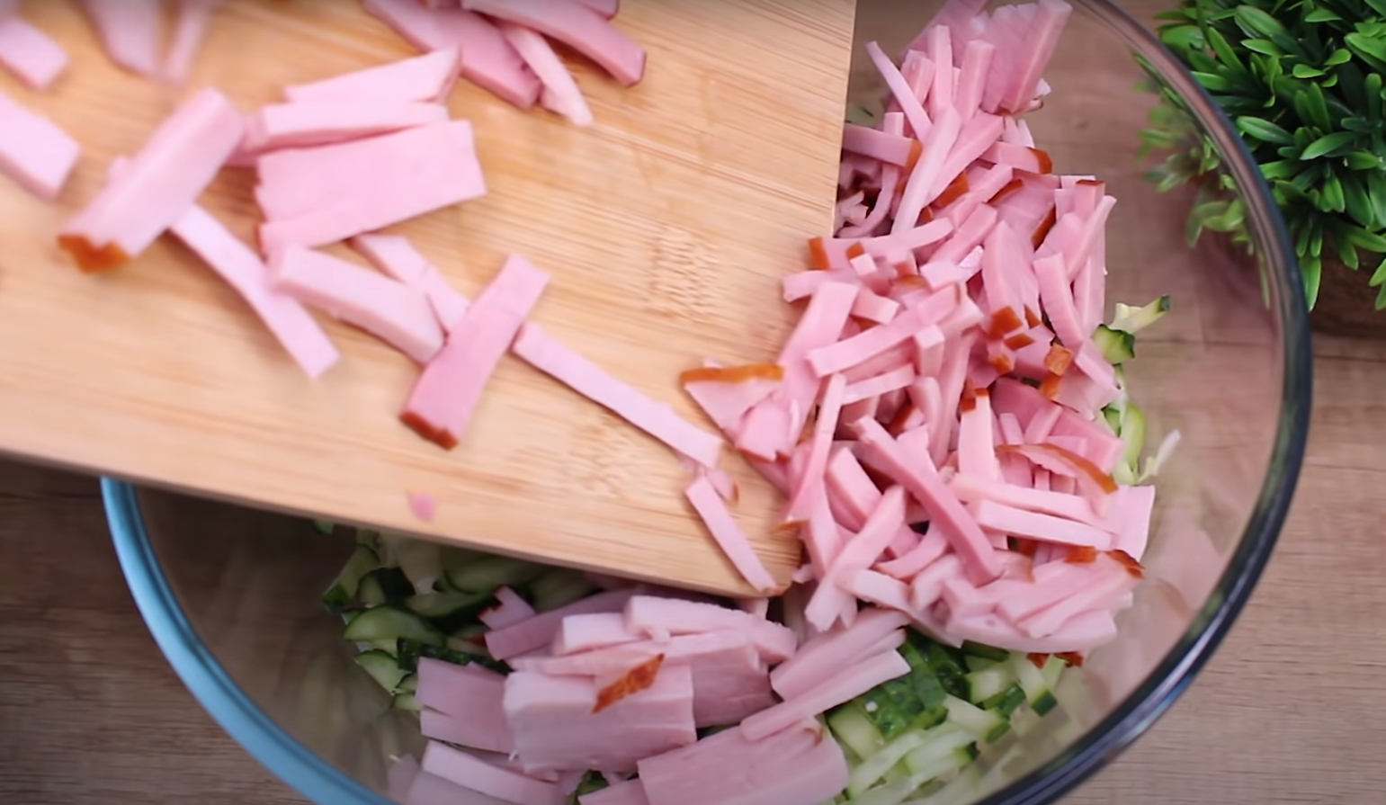 1. Do wysokiej miski poszatkuj drobno kapustę, dodaj pokrojone w kostkę i obrane ogórki oraz pokrojoną w drobne paski ulubioną szynkę.