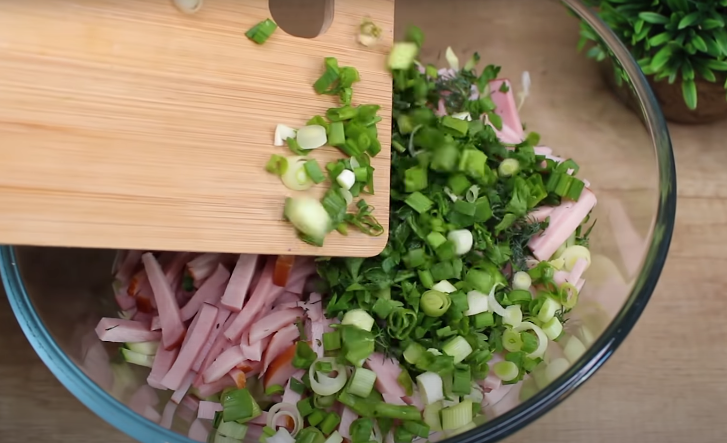 2. Następnie, dodaj drobno pokrojoną dymkę, posiekany koperek i szczypiorek.