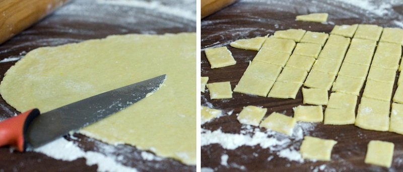 5. Teraz, każdą rozwałkowaną część ciasta, pokrój na małe kwadraciki.