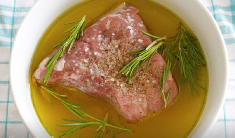 1. W misce, wymieszaj wino, ocet, oliwę, rozmaryn i pieprz. Mięso umyj, osusz ręcznikiem papierowym i natrzyj przygotowaną marynatą. Odstaw na co najmniej 2 godziny.