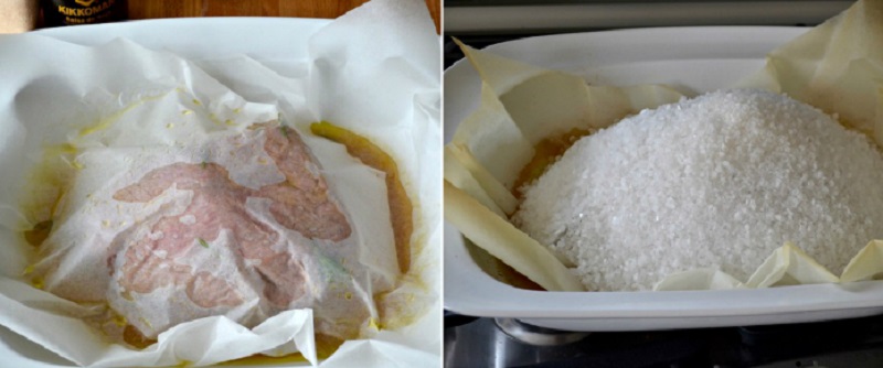 2. Teraz, przełóż mięso do wysokiego naczynia żaroodpornego, polej pozostałą marynatą i przykryj naczynie papierem do pieczenia. Na papier, wysyp równomiernie 1 kg soli.