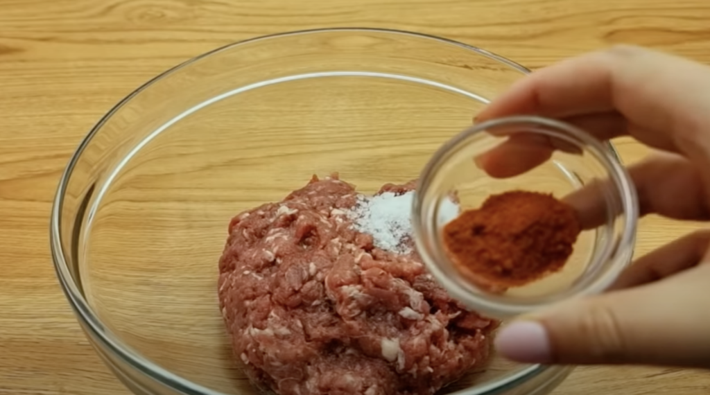 Mięso mielone przełóż do miski. Dodaj sól, pieprz, rozmaryn i słodką paprykę.