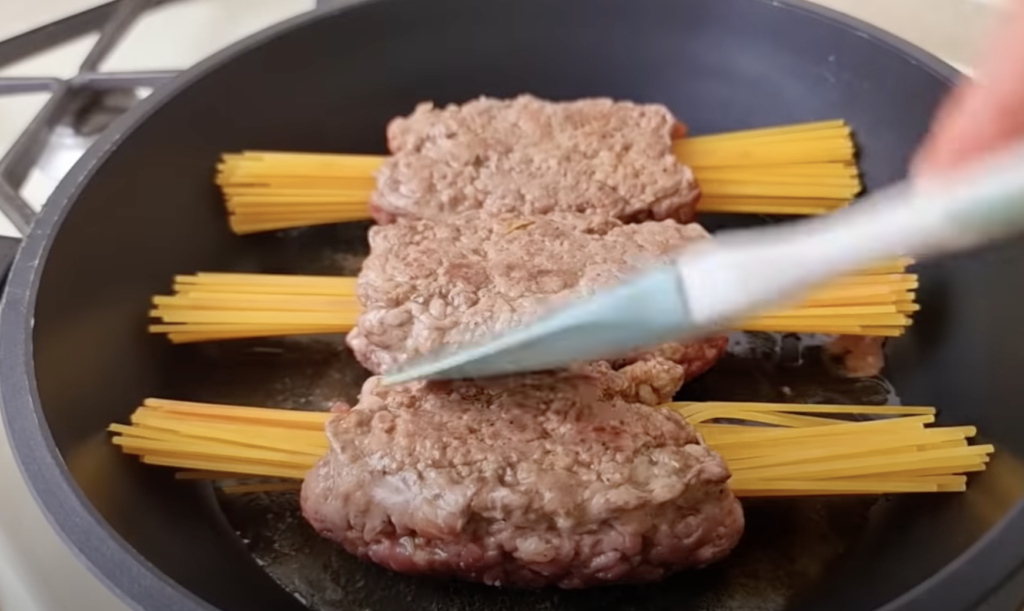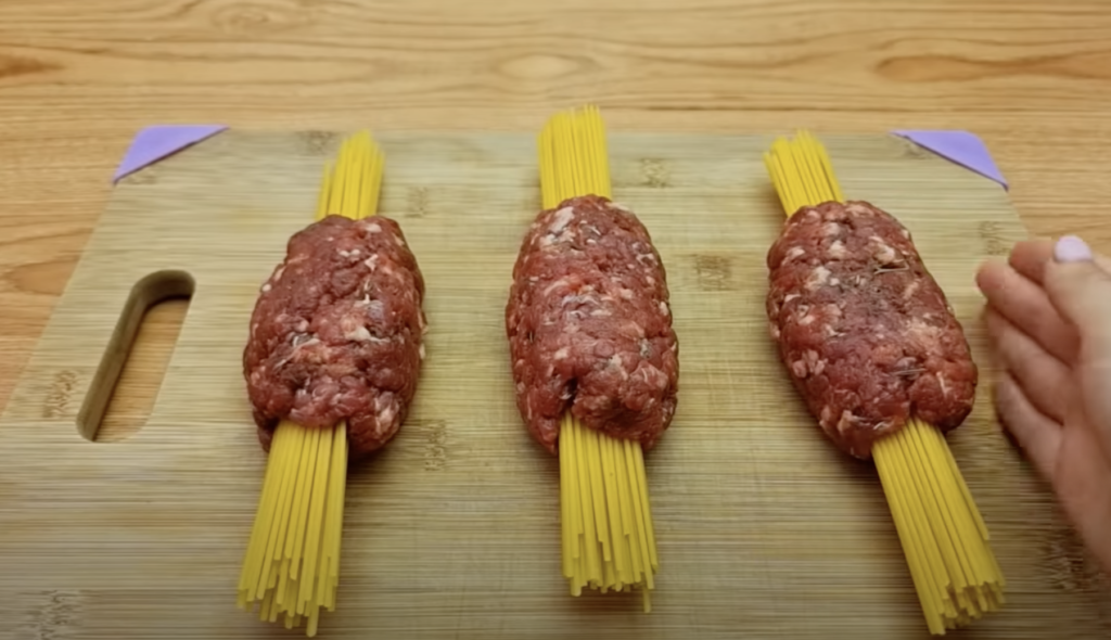 Makaron spaghetti podziel na trzy części. Każda porcję owiń w połowie długości mięsem mielonym – na tym etapie potrawa wygląda jak kotlet mielony nabity na makaron.